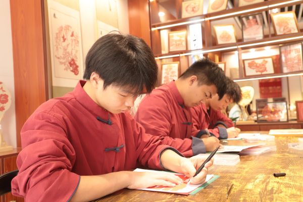 隨后,在導師的悉心指導下,學生們紛紛化身為小小匠人,全神貫注地投入到手工創作的世界。在刻紙畫區域,他們細心勾勒線條,精準雕琢每一細節,每一刀一劃都透露出對美的追求與對傳統的敬畏。而在剪紙區,五彩斑斕的紙張在學生們靈巧的雙手下漸漸幻化為生動的圖案,每一幅作品都蘊含著創作者獨特的情感與想象,成為了非遺文化與現代創意完美融合的見證。